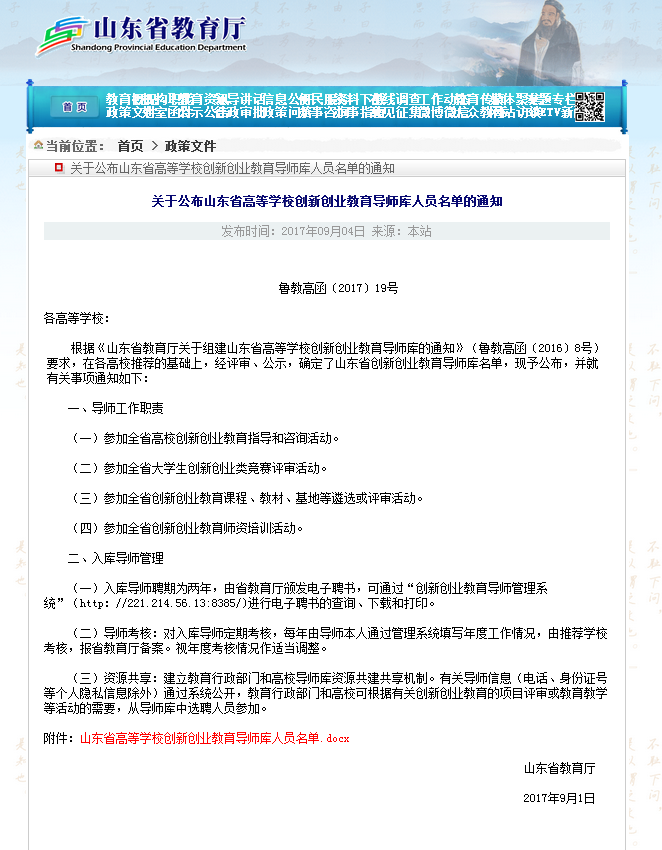 近日,山东省教育厅公布了“山东省首批创新创业教育导师库”入选名单,我院李建军、孙永奇、崔风江(特聘山东海瓷集团校外创业导师)3位教师入选。