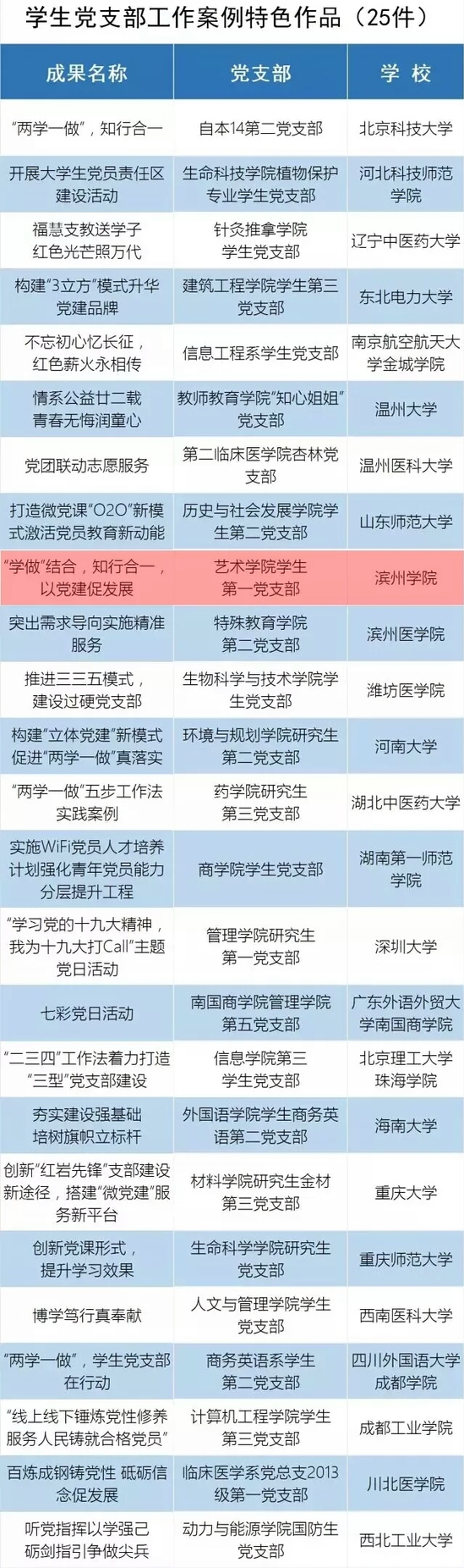 日前,教育部思政司公示了第二届全国高校“两学一做”支部风采展示活动遴选结果名单。名单有微党课作品、工作案例作品和支部推荐展示作品3个类型。每个类型100个,分为教工支部和学生支部2个类别,每个类别有精品、优秀、特色3个层次,遴选数量分别是10、15、25。由滨州学院党委组织部选送的英国365集团学生第一党支部《“学做”结合,知行合一,以党建促发展》入选学生党支部工作案例特色作品(25件)。
