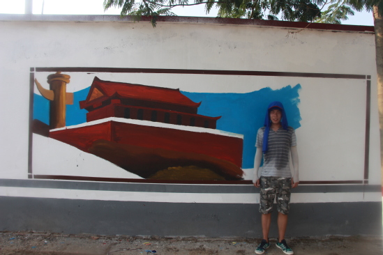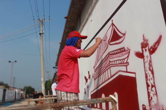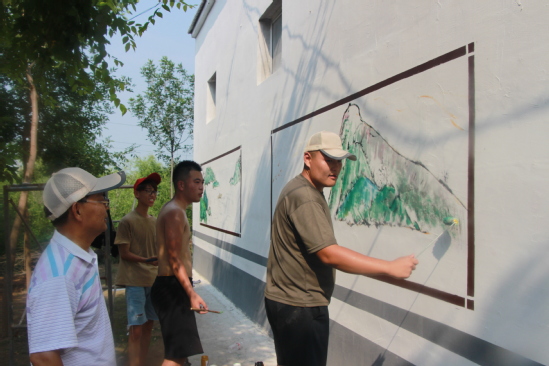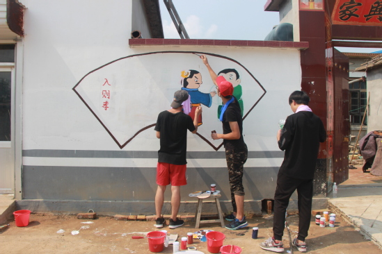 烈日炎炎,骄阳似火,团队50名成员脚踩着这片朴实的土地,热情高涨,干劲十足,从准备画具、测量墙面、调试颜料开始,活动过程中,烈日暴晒,挥汗如雨,汗水湿透衣衫,队员们不叫苦,不叫累,克服重重困难,默契配合,挥笔泼墨,精心绘制,耐心向村民诠释图画、标语的内容和内涵,宣传新时代振兴乡村政策、社会主义核心价值观,进行法治教育宣传。经过长达10多小时的高温下高强度的作业,顺利完成了34幅,共计300余平米的墙绘作品。参与活动的同学说:“村中的老人坐着小板凳静静的看着我们绘画,并不时的夸赞我们,就图画、标语内容和我们交流,送上绿豆汤和西瓜,端出清水,拿出肥皂帮助我们洗掉沾满颜料的双手,村民们是那么的淳朴善良,我们很有成就感,觉得所有的辛苦都是值得的,我们争取以后多参与社会实践活动,用自己的知识和劳动为新时代农村文化建设增添一份色彩,贡献一份力量。”
