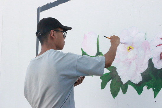 烈日炎炎,骄阳似火,服务团同学脚踩着这片朴实的土地,热情高涨,干劲十足,从准备画具、测量墙面、调试颜料开始,活动过程中,烈日暴晒,挥汗如雨,汗水湿透衣衫,队员们不叫苦,不叫累,克服重重困难,默契配合,挥笔泼墨,精心绘制,耐心向村民诠释图画、标语的内容和内涵。经过长达10个多小时的高温下高强度的作业,顺利完成了8幅、共计100余平米的墙绘作品。