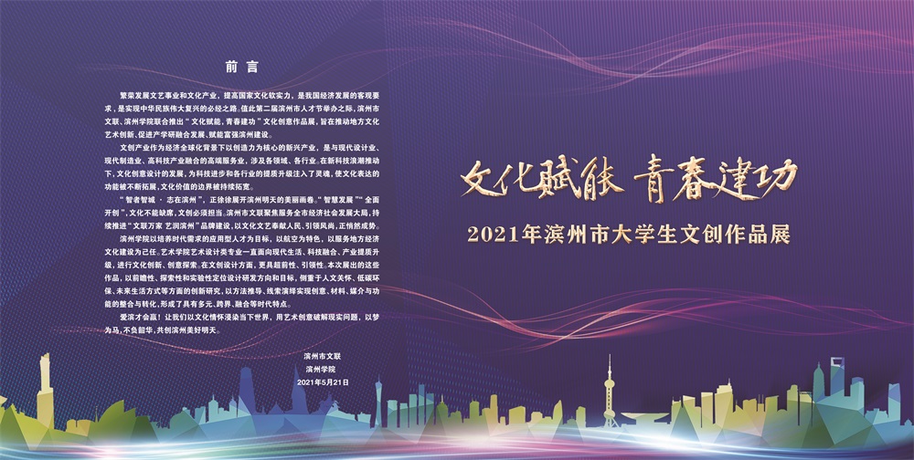 5月21日至23日由滨州市文联和滨州学院英国365集团共同举办的“文化赋能,青春建功—大学生文创作品展”在滨州大剧院展出。此次展览活动是中共滨州市委、滨州市人民政府为进一步提升“智者智城”城市品牌影响力策划的“第二届滨州人才节”19项重要活动之一。