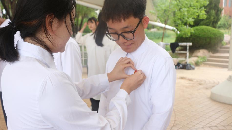 仪式第三项,老团员为新团员颁发团徽,佩戴团徽。中国共青团团徽象征着共青团在习近平新时代中国特色社会主义思想的光辉照耀下,团结各族青年,朝着党所指引的方向奋勇前进。