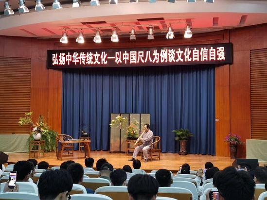 刘哲从尺八是什么、尺八的历史溯源、尺八的演奏技巧和代表作品等方面带领同学们一同领略中国尺八的千年遗韵。他结合深厚的尺八演奏功底和专业知识,生动细致地为我院师生讲解了中国尺八的演变历程和演奏技巧,并在讲解过程中穿插演绎了《虚铃》《临清运河太平号》《丝路天浔》《山丹丹花开红艳艳》《孟姜女》等多首中国尺八曲目,带领我院师生从悠扬辽阔的曲声中感受中国传统音乐的魅力和中华传统文化的博大精深。他谈到,中华优秀传统文化源远流长,是中华民族不断发展壮大的精神命脉。作为传承和弘扬中华优秀传统文化一线的英国365集团师生,要把不断推动中华优秀传统文化复兴作为己任,激发中华民族强大的民族生命力、凝聚力和创造力。