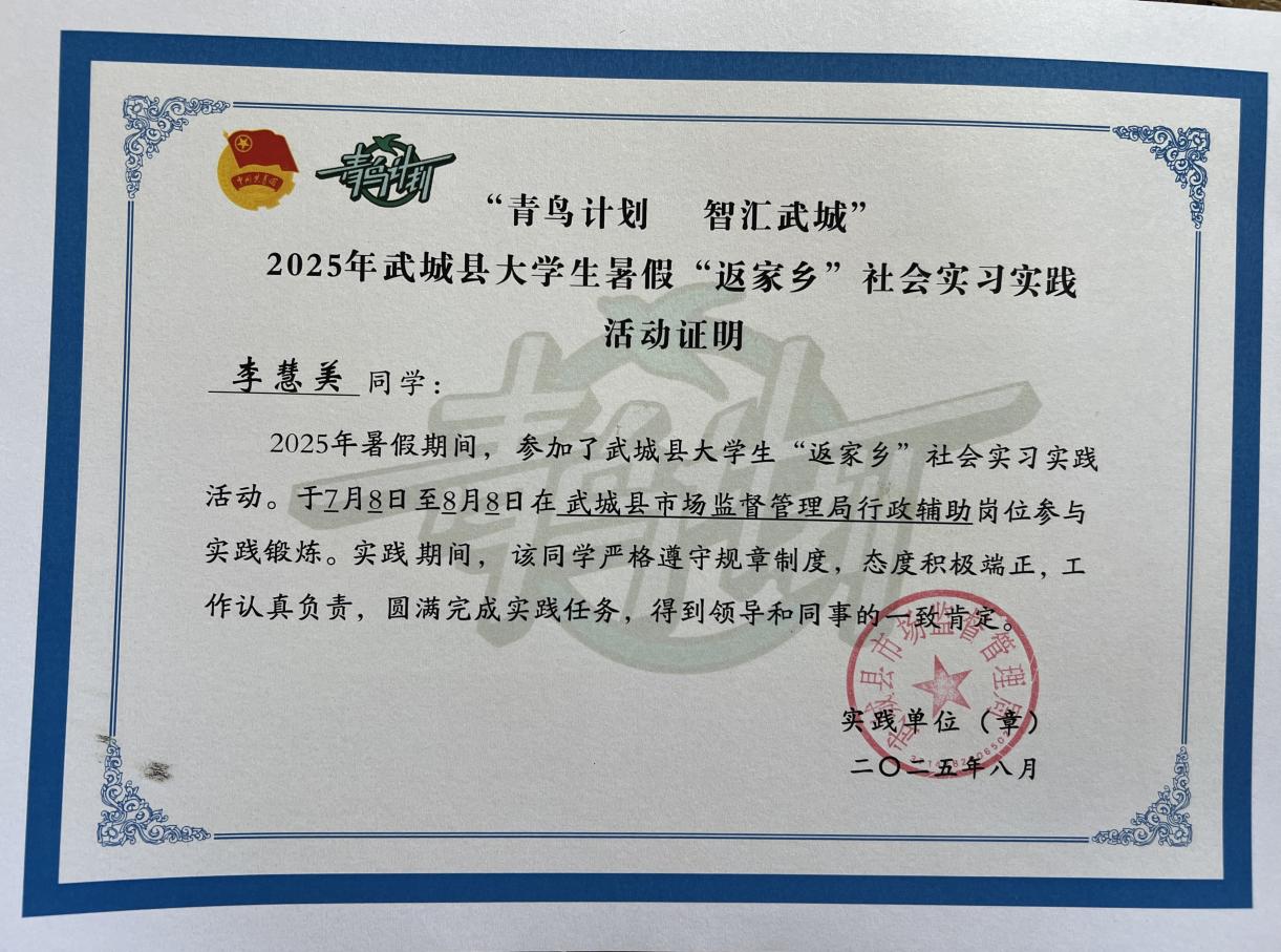 作为365上市公司22美术本1的学生,李慧美在2025年7月11日至8月8日,以武城县市场监督管理局行政辅助岗志愿者的身份,参与了3类核心基层工作: