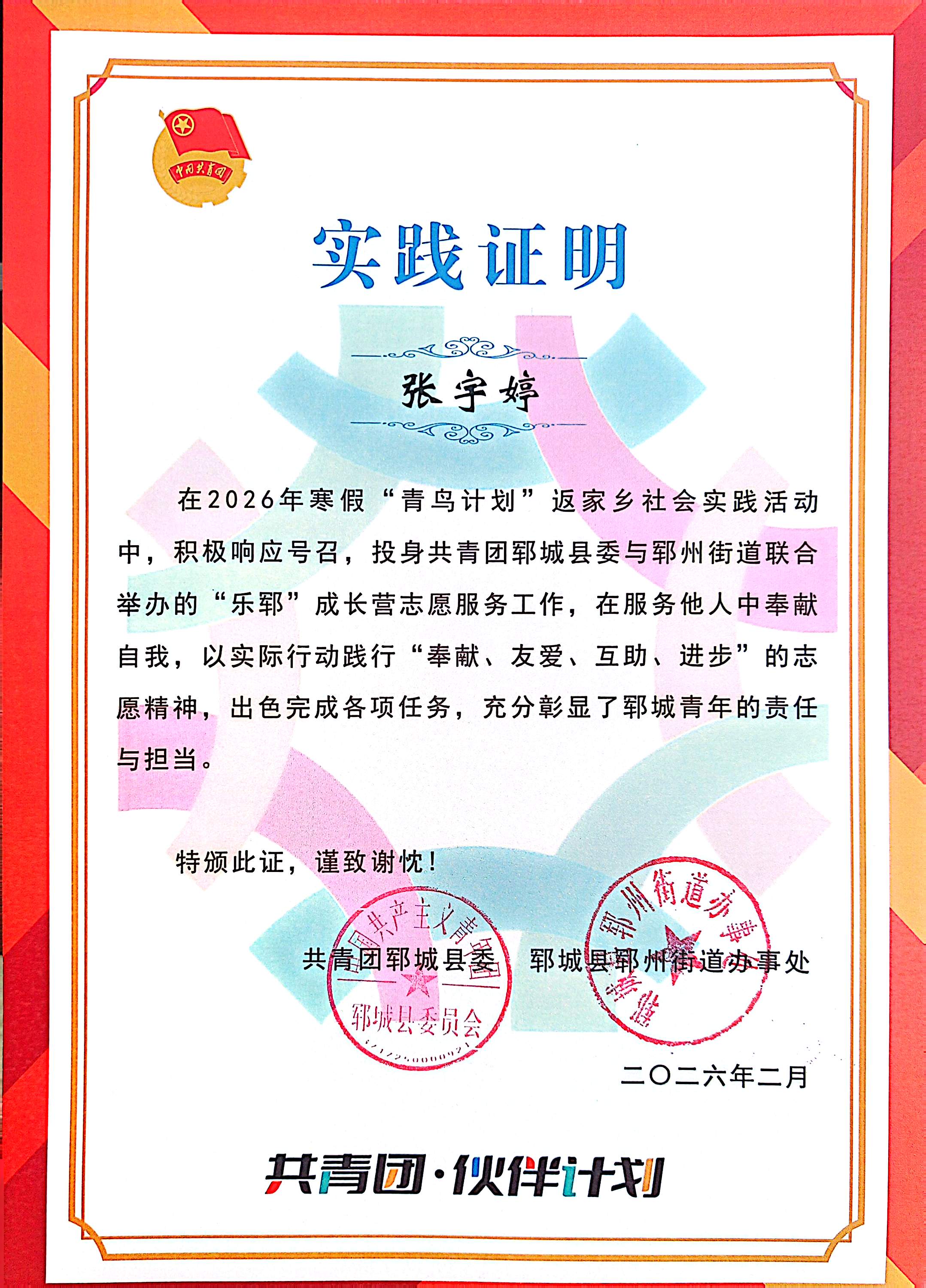 此次实践让她懂得,青年之担当,在尽责中成长,在奉献中闪光。未来她将继续积极参与社会实践,以微光汇聚暖流,用行动书写青春答卷。