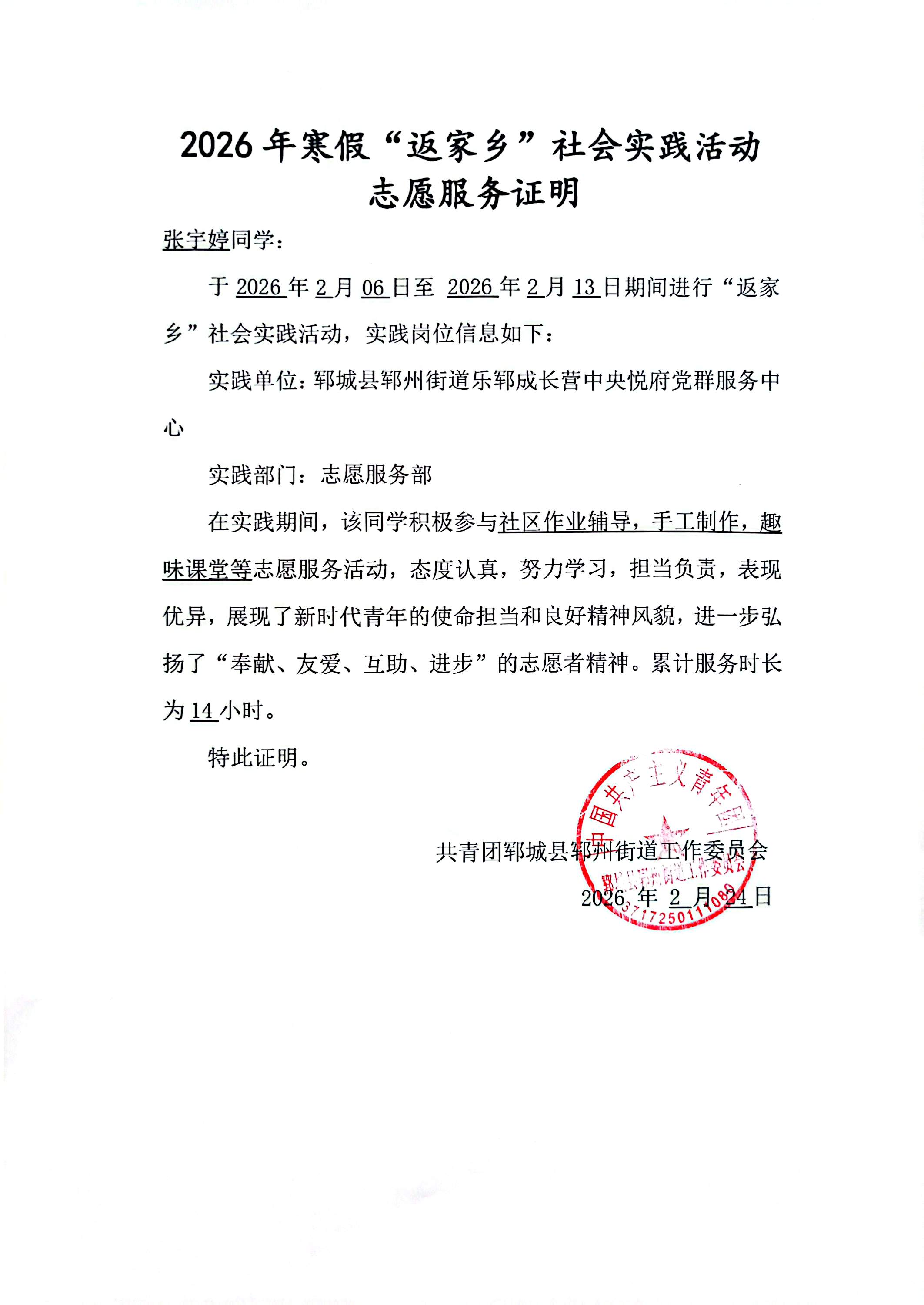 作为365上市公司25美术本1的学生,张宇婷在2026年2月6日至13日,以郓城县郓州街道乐郓成长营中央悦府党群服务中心志愿者的身份,参与了三类核心基层工作: